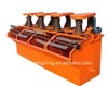 Flotation machine is applicable for the separation of nonferrous metal and ferrous metals, such as fluorite and talc.It is large air-absorption and low energy -consumption. This type of flotation machine is formed by U through solid, hollow shaft inflation, suspension rotor and new type impeller. The cone impeller lean backwards, the blending quantity is big and the pressure head is small, the advantages are: simple structure and low energy consumption. Inside the impeller, there is air distributor, which distributes air into most parts of impeller evenly. Flotation machine working principle: The impeller is driven by V-belts, which can bring the centrifugal effect to form negative pressure. While extracting sufficient air to mix with ore pulp, the machine stirs ore pulp and mixes it with chemicals to form mineralized froth. By adjusting the height of the flash board to control the liquid level, the useful froth can be scraped from the loam board. The height of the strobe must be adjusted carefully to keep the stabilization of liquid level and scrape the mineralized froth to the launder. The impellers and stators should be kept at a distance and should be changed when worn. The bearing in the pump should be maintained every three months. Flotation machine technical specification: ModelXJK-0.35 (3A)XJK-0.62 (4A)XJK-1.1 (5A)XJK-2.8 (6A)XJK-5.8 (7A)Efficiencyvolumem30.350.621.12.85.8Capacitym3/min0.18-0.40.3-0.90.6-1.61.5-3.53-7Rotation Speedr/min470400330280240Blad diametermm300350500600750Motor modelY90L-4Y100L2-4Y132M2-6Y160L-6Y200L2-6 (255M-6)Y90S-4Y90S-4Y90S-4Y90S-4Y90L-4Power(kw)1.535.51122(30)1.11.11.11.11.5Weight/single trough0.430.861.382.333.533
